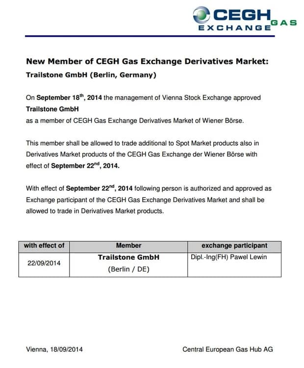 Так вот немецкая TrailStone получила аккредитацию на австрийской газовой бирже только 22 сентября прошлого года. Так что как газотрейдеру всего один год, а отнюдь не 15.