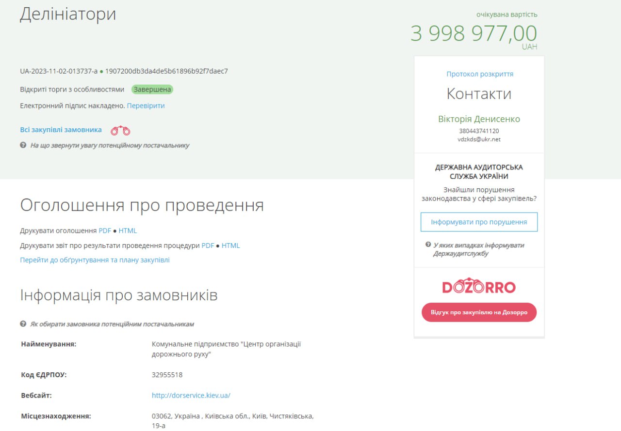 КП Київської міськради "Центр організації дорожнього руху" замовило 1914 поліуретанових делінеаторів (дорожні обмежувачі) за 3,9 млн гривень, у ТОВ "Торговий дім "Призма".