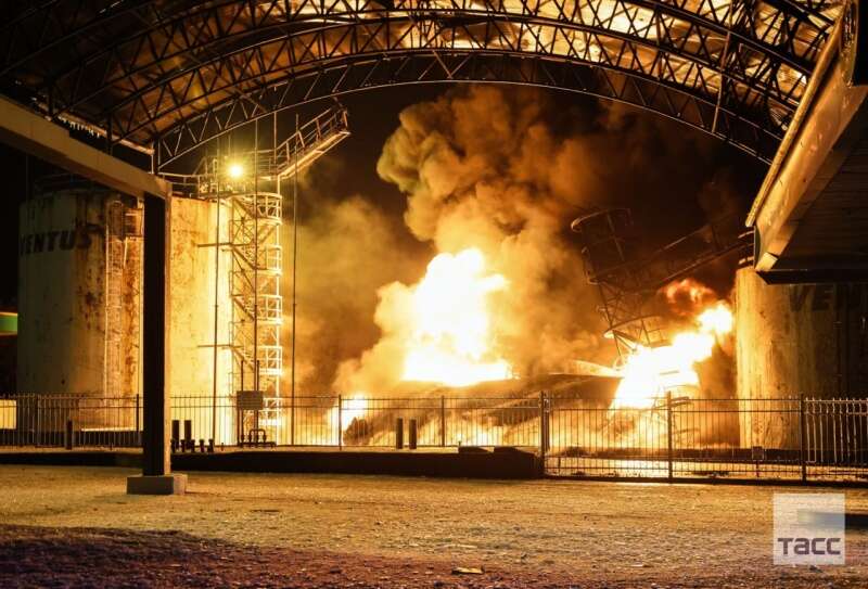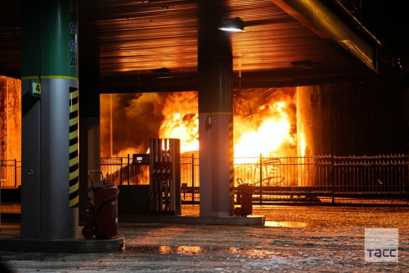 "ТАРС" опублікувало фотографії з місця "прильоту". На фото можна побачити сильну пожежу на нафтобазі.