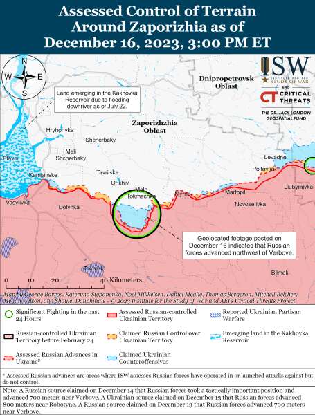 Українські війська 16 грудня продовжували контрнаступальні дії в районі Роботино на заході Запорізької області, але жодного підтвердженого наступу не вчинили.