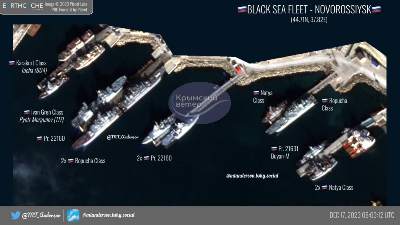 Так, згідно з супутниковими знімками OSINT дослідника MT Anderson за 17 грудня, відомо, що наразі в порту Новоросійська знаходяться 20 російських суден, 10 з яких – ракетоносії.