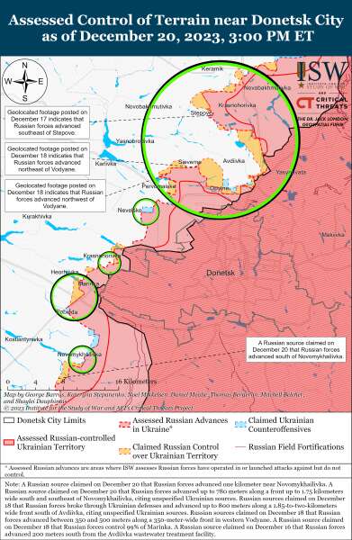 Декілька "воєнкорів" з РФ стверджували, що російські війська нібито просунулися до 1,5 кілометрів поблизу Роботиного та Новопрокопівки, хоча ISW не спостерігається візуального підтвердження цих заяв.