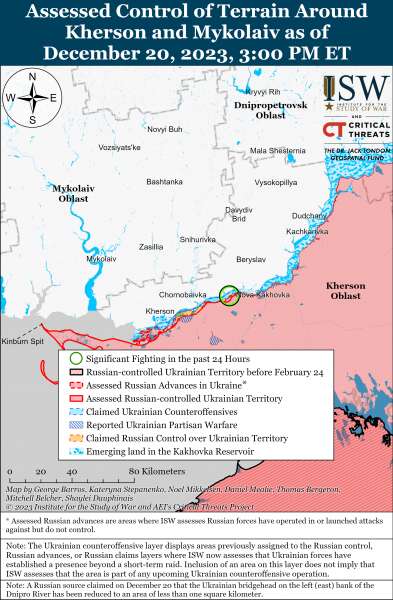 Українські війська зберігають присутність на східному (лівому) березі Дніпра у Херсонській області станом на 20 грудня, однак підтверджених змін лінії фронту на цій ділянці не було.