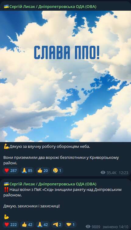 Також сьогодні сили ППО знищили ракету над Дніпровським районом та збили два безпілотники над Криворізьким районом, повідомив голова Дніпропетровської ОВ Сергій Лисак.