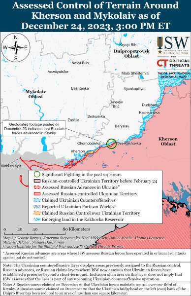 24 грудня українські сили утримують позиції на східному (лівому березі) Херсонської області. Російські та українські джерела стверджували, що позиційні бойові дії тривали на східному березі, у тому числі поблизу Кринків.