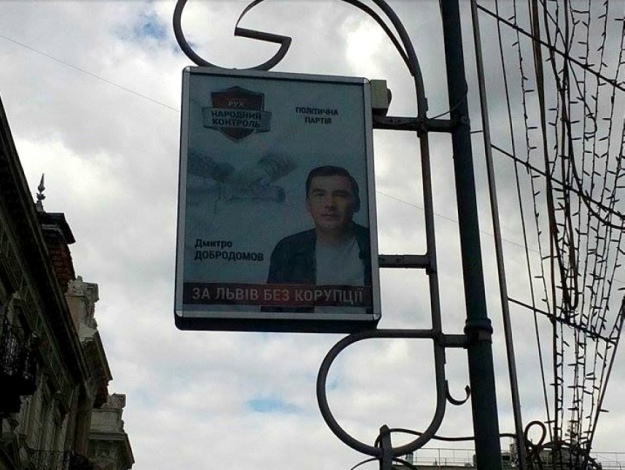 І якщо на базі перших двох слоганів будується кампанія цілої партії, яка позиціонує себе як партія журналістів, активістів, військових – то лозунг «За Львів без корупції» зустрічаємо вже на агітаційних матеріалах до мерської кампанії Добродомова.