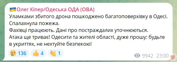 "Спалахнула пожежа. Фахівці працюють. Дані про постраждалих уточнюються. Атака ще триває! Одесити та жителі області, дуже прошу: будьте в укриттях, не нехтуйте безпекою!"