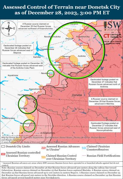 Геолокаційні кадри, опубліковані 28 грудня, показують, що війська РФ незначно просунулися поблизу Авдіївського коксохімічного заводу на північний захід від міста. Російські блогери стверджували, що війська РФ нібито просунулися до 800 метрів від Сєверного, поблизу Очеретиного вздовж залізниці та в промисловій зоні.