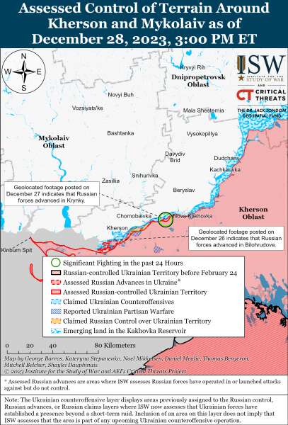 Українські сили утримують позиції на східному (лівому) березі Херсонської області станом на 28 грудня, але ні російські, ні українські війська не досягли підтверджених успіхів у цьому районі.