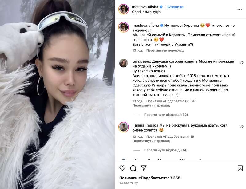 Російська блогерка та співачка Аліна Маслова, яка живе в Москві та розповідає, що "любить Росію та Україну однаково", приїхала на відпочинок до українських Карпат. Дівчина радо хизується курортом в Драгобраті, куди, як розповіла вона сама, приїхала святкувати Новий рік із сімʼєю.