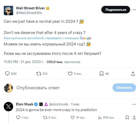 Ілон Маск прогнозує, що 2024 рік "буде ще божевільнішим"
