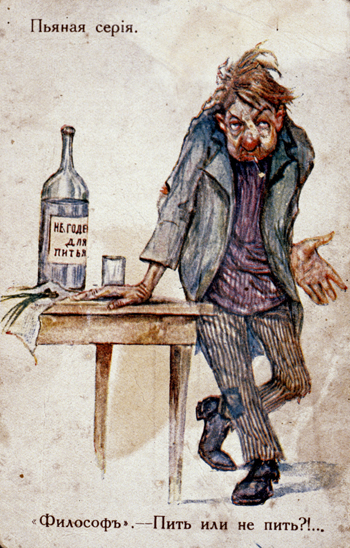 Сатирическая открытка «Философ. — Пить или не пить?!... », выпущенная в годы Первой мировой, когда в России действовал «сухой закон». Из коллекции собирателя открыток Михаила Блинова