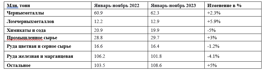 Таблиця 3: Завантаження окремих категорій вантажів у системі РЖД, січень-листопад 2023 р. порівняно з аналогічним періодом 2022 р.