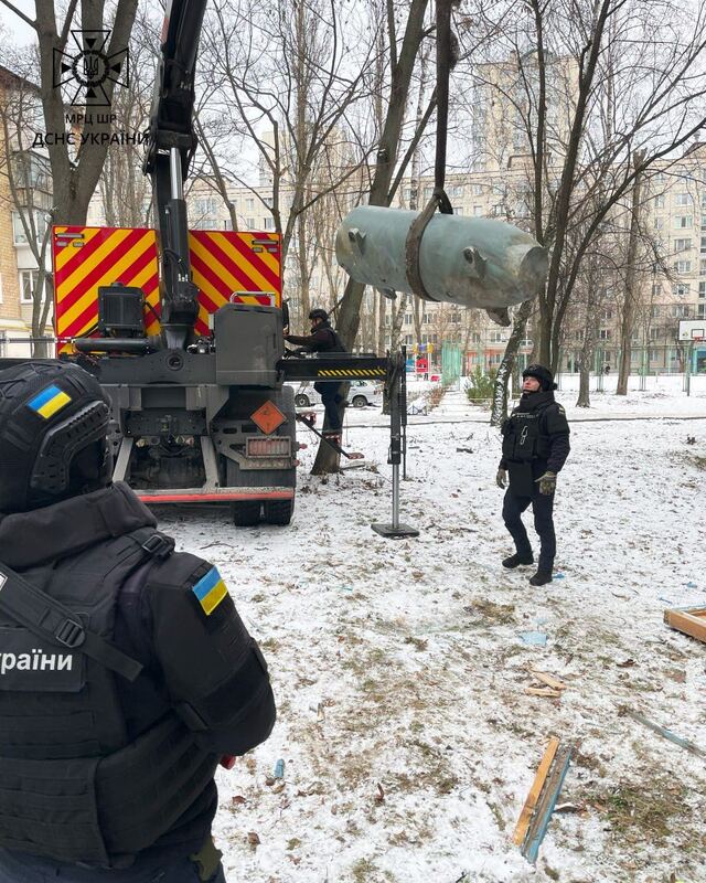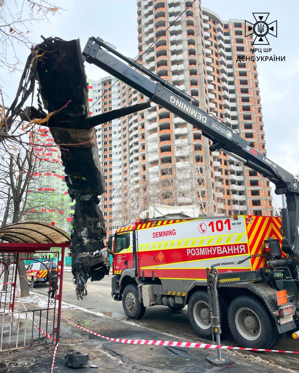 Піротехніки Мобільного рятувального центру ДСНС України ліквідовують наслідки обстрілу столиці у Святошинському районі.