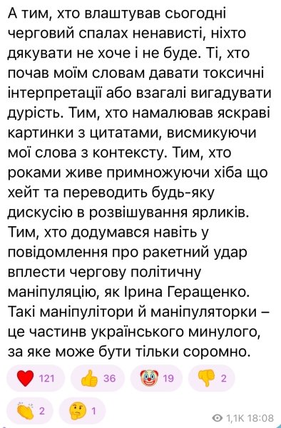 "Ті, хто почав моїм словам давати токсичні інтерпретації або взагалі вигадувати дурість. Тим, хто намалював яскраві картинки з цитатами, висмикуючи мої слова з контексту. Тим, хто роками живе примножуючи хіба що хейт і переводить будь-яку дискусію в розвішування ярликів", — каже Лещенко.