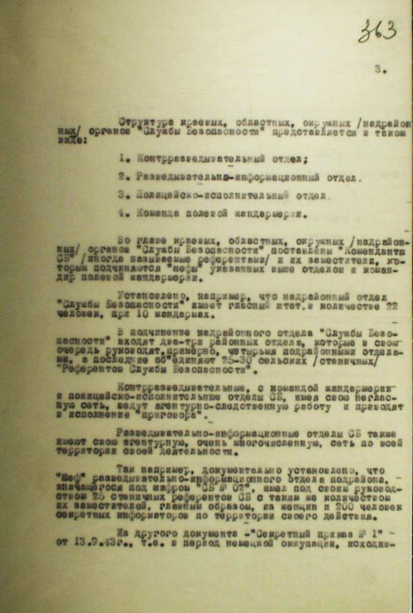 У «Секретному наказі № 1» від 13.09.1943 року, підписаному референтом СБ на псевдо «Грім», наводяться завдання відділу:
