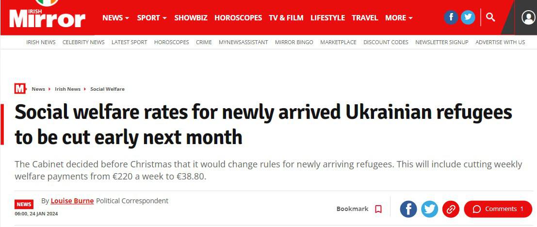 На початку лютого уряд Ірландії планує скоротити розмір щотижневих соціальних виплат для новоприбулих українських біженців з 220 до 38,80 євро.