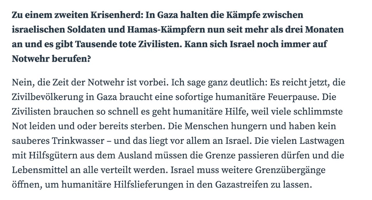 "Час самооборони минув. Я говорю цілком ясно: досить, громадянське населення Гази потребує негайного гуманітарного припинення вогню. Люди голодують і не мають чистої питної води – і виною цьому насамперед Ізраїль. Ізраїль має відкрити більше прикордонних переходів, щоб забезпечити доставку гуманітарної допомоги у секторі Газа", - заявила міністр закордонних справ Фінляндії Еліна Валтонен в інтерв’ю RND.