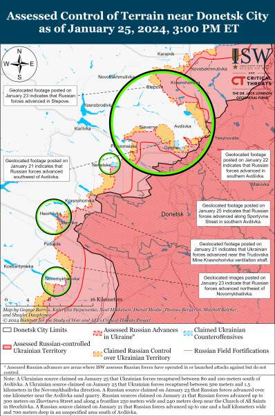 Геолокаційні кадри, опубліковані 25 січня, показують, що війська РФ нещодавно просунулися на південний захід від Степового (на північний захід від Авдіївки) і вздовж вулиці Спортивної в найпівденнішому житловому районі Авдіївки.