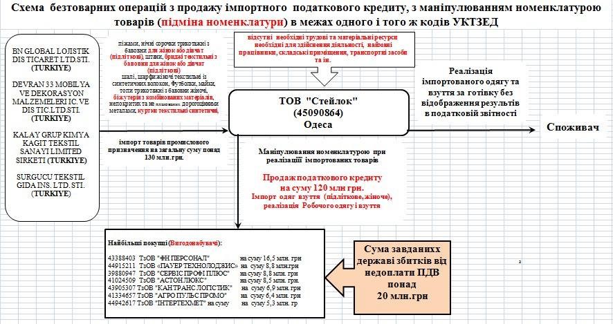 Наочна схема безтоварних операцій з продажу імпортного податкового кредиту, з маніпулюванням номенклатурою товарів (підміна номенклатури) в межах одного і того ж кодів УКТЗЕД. ТОВ "Стейлок" (Одеса) імпортувала у турецьких виробників товарів на суму 130 млн. грн.