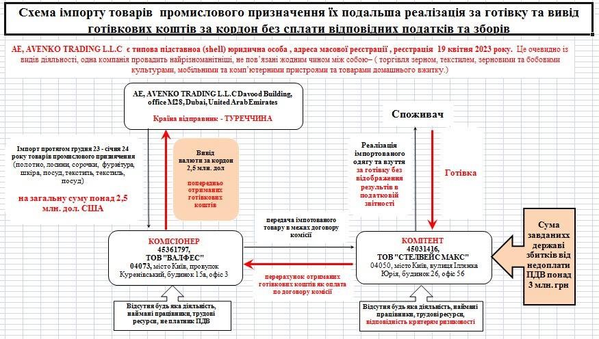Свіжа схема імпорту товарів промислового призначення їхня подальша реалізація за готівку та вивід готівкових коштів за кордон без сплати відповідних податків та зборів. AE, AVENKO TRADING L.L.C є типова підставна юридична особа , адреса масової реєстрації , реєстрація 19 квітня 2023 року. Це очевидно із видів діяльності, одна компанія провадить найрізноманітніші, не пов’язані жодним чином між собою– (торгівля зерном, текстилем, зерновими та бобовими культурами, мобільними та комп’ютерними пристроями та товарами домашнього вжитку.) Сума завданих державі збитків від недоплати ПДВ понад 3 млн. грн.