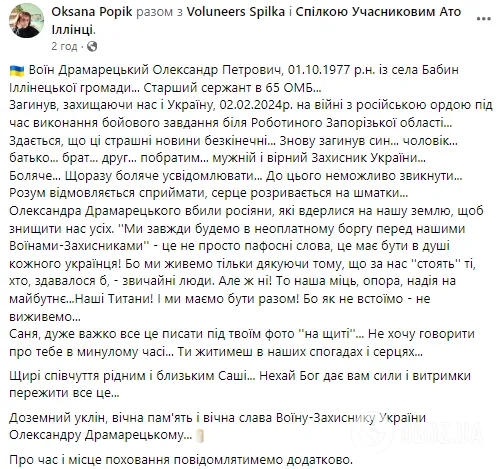 "Здається, що ці страшні новини нескінченні... Знову загинув син, чоловік, батько, брат, друг, побратим, мужній і вірний Захисник України... Боляче. Щоразу боляче усвідомлювати. До цього неможливо звикнути. Розум відмовляється сприймати, серце розривається на шматки..." – написала вона.