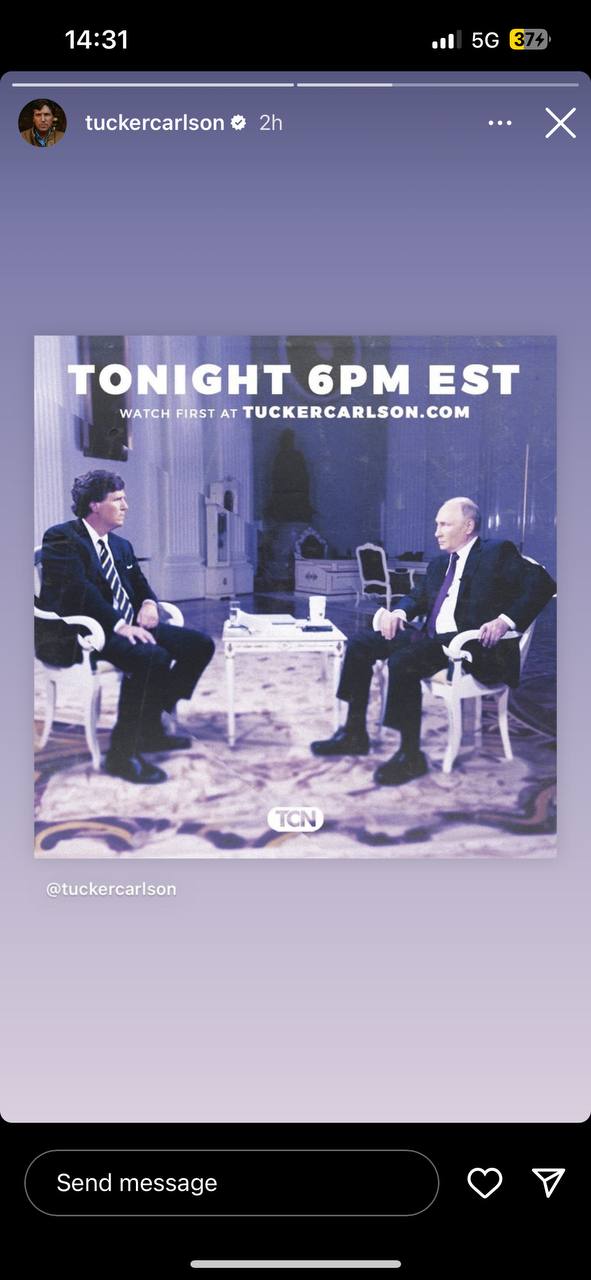 Такер Карлсон опублікував у соцмережах першу фотографію з російським диктатором Путіним