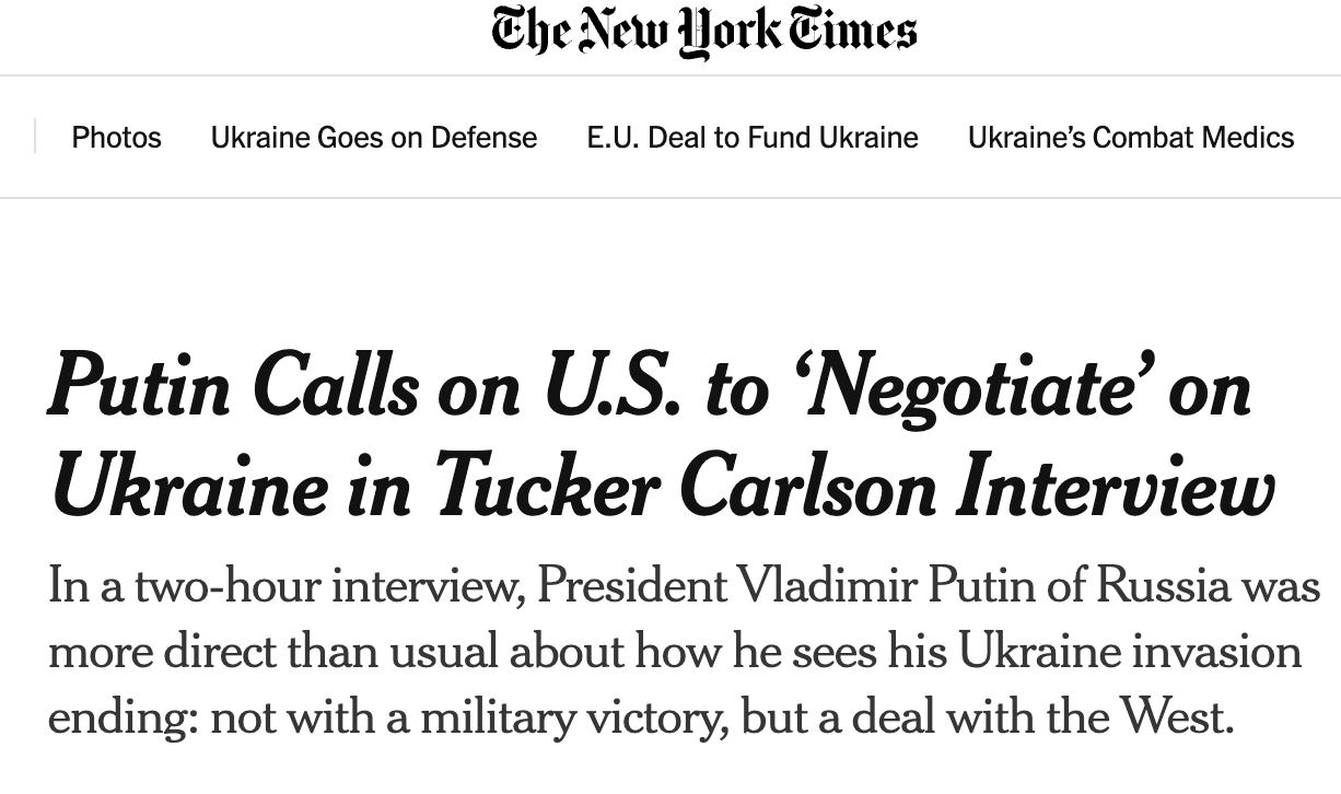 Автори статті пишуть, що у двогодинному інтерв’ю Путін "був більш відвертим, ніж зазвичай", про те, як він бачить закінчення свого вторгнення в Україну: "не військовою перемогою, а угодою із Заходом". Угода ця передбачає "передачу частини української території Росії".