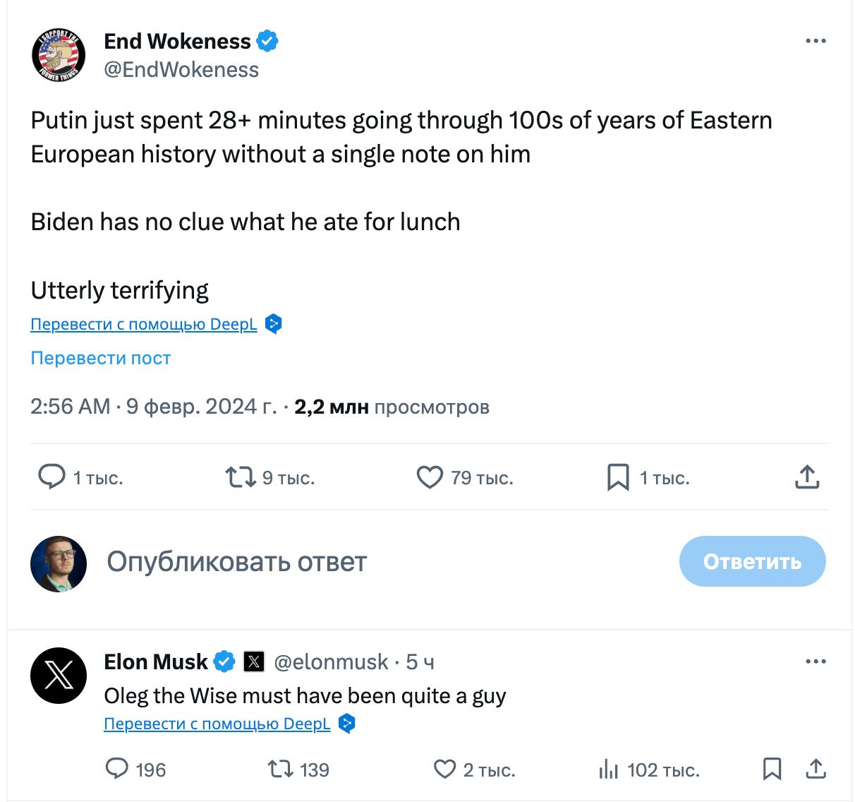 На коментар користувача, що "сьогодні президент Росії виголосив 30-хвилинний монолог про геополітику Радянського Союзу XX століття, а нашого президента було визнано в суді недієздатним", Маск написав: "Дикі часи".