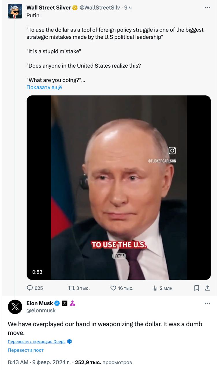 А також підтримав Путіна, який кілька разів говорив, що "використання долара як інструмент зовнішньополітичної боротьби є однією з найбільших стратегічних помилок політичного керівництва США".
