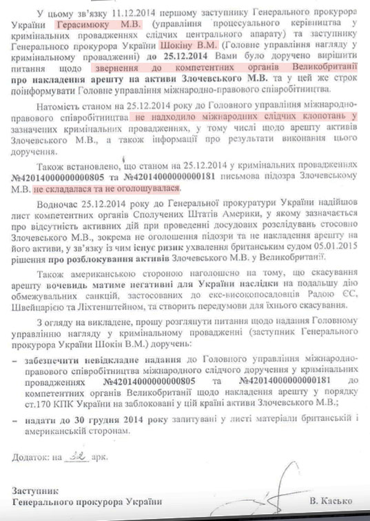 Тогдашний генпрокурор Ярема поручает Герасимюку и Шокину до 25 декабря решить вопрос об обращении к британским правоохранителей по делу Злочевского, но по состоянию на это число никаких документов Касько, который отвечал за международную правовую помощь, получено не было. А тремя днями ранее Герасимюк, который завершил свою миссию, "слив" дело Злочевского в милицию, пишет ... заявление об отставке по собственному желанию!