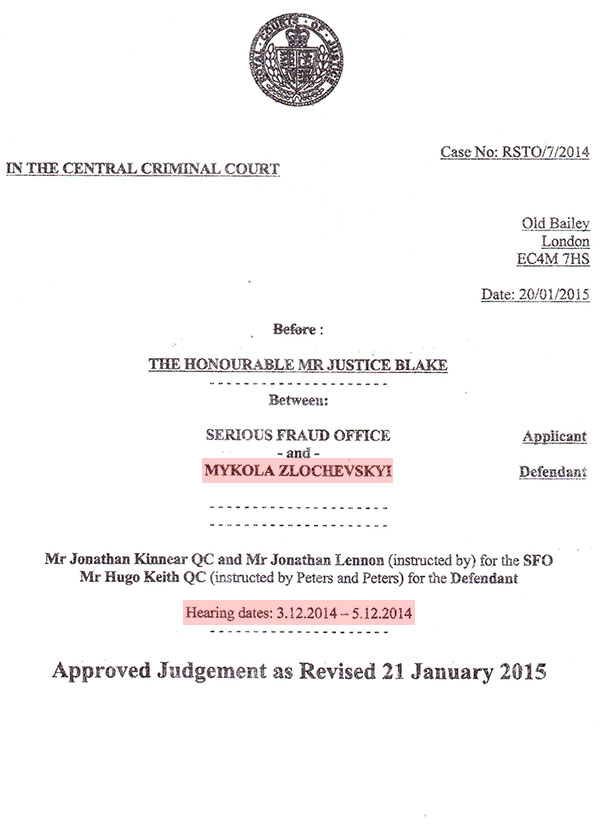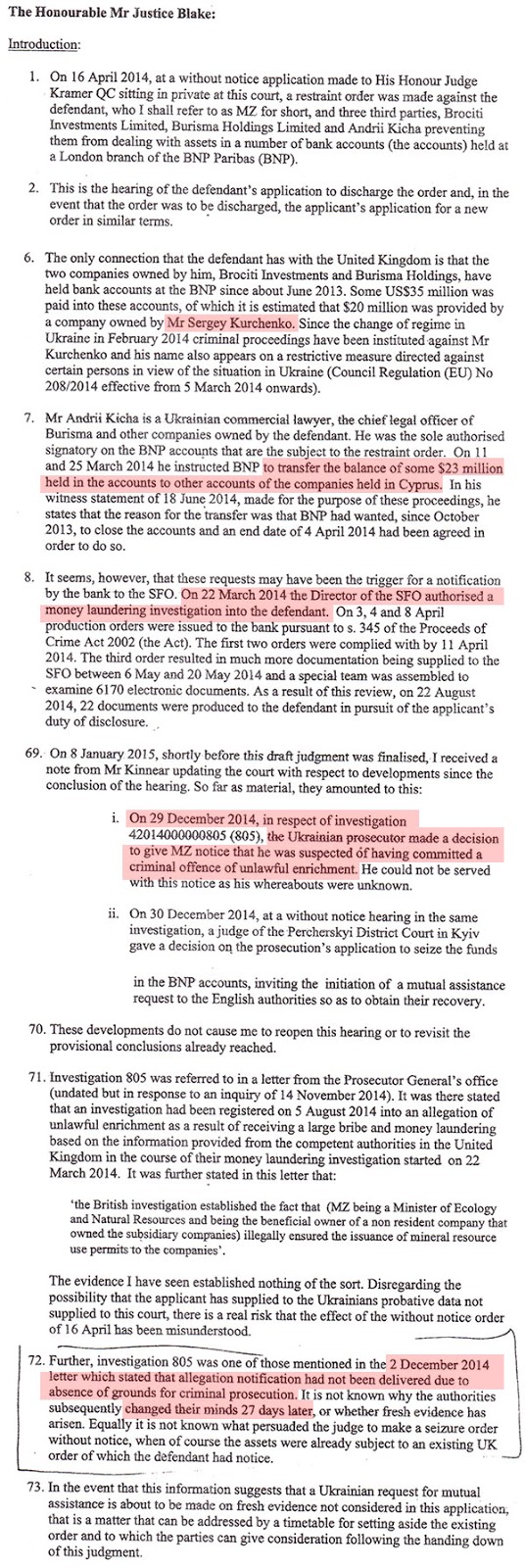 Все эти метания были приняты к сведению судом в Лондоне, который удовлетворяет ходатайство Злочевского и снимает арест с денежных средств. Судья в постановлении обращает внимание на непоследовательность позиции украинской прокуратуры, которая с разницей в 27 дней дает письмо Злочевскому о его чистоте перед законом (дело рук Залиски и Герасимюка), а затем вручает подозрение (под влиянием посольства США и по настоянию Касько).