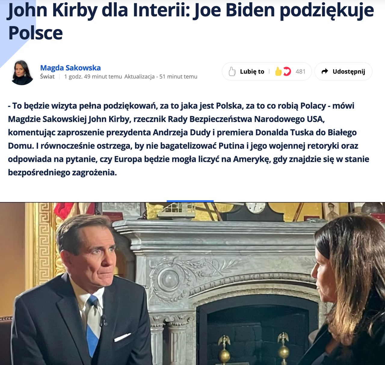 «Зараз, звісно, Росія зосереджена, якщо не сказати, у пастці, в Україні. Ми не бачимо прямої загрози НАТО, східному флангу, не бачимо її зараз. Однак Путін ясно дає зрозуміти, що він не хоче, щоб НАТО було сильним чи розширюваним. Він однаково ясно дає зрозуміти, що для нього війна, яку він веде в Україні, – це битва Росії проти Заходу, або що це битва Сполучених Штатів проти Росії, або навіть Росії проти НАТО», – заявив Кірбі в інтерв’ю польському виданню Interia.