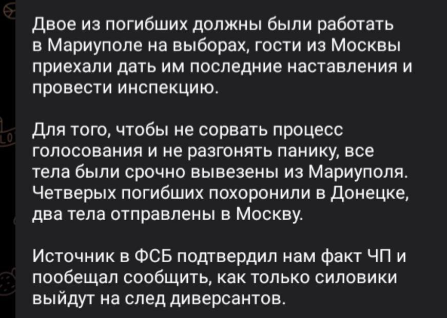В одній із квартир тимчасово окупованого Маріуполя знайшли тіла шести осіб, які отруїлися їжею та напоями, які замовили з ресторану. Двоє з них були місцевими активістами російської партії "Єдіная Росія", ще четверо – "важливі гості" з Москви, які приїхали дати вказівки щодо проведення виборів. Були серед них і працівники ЦВК РФ