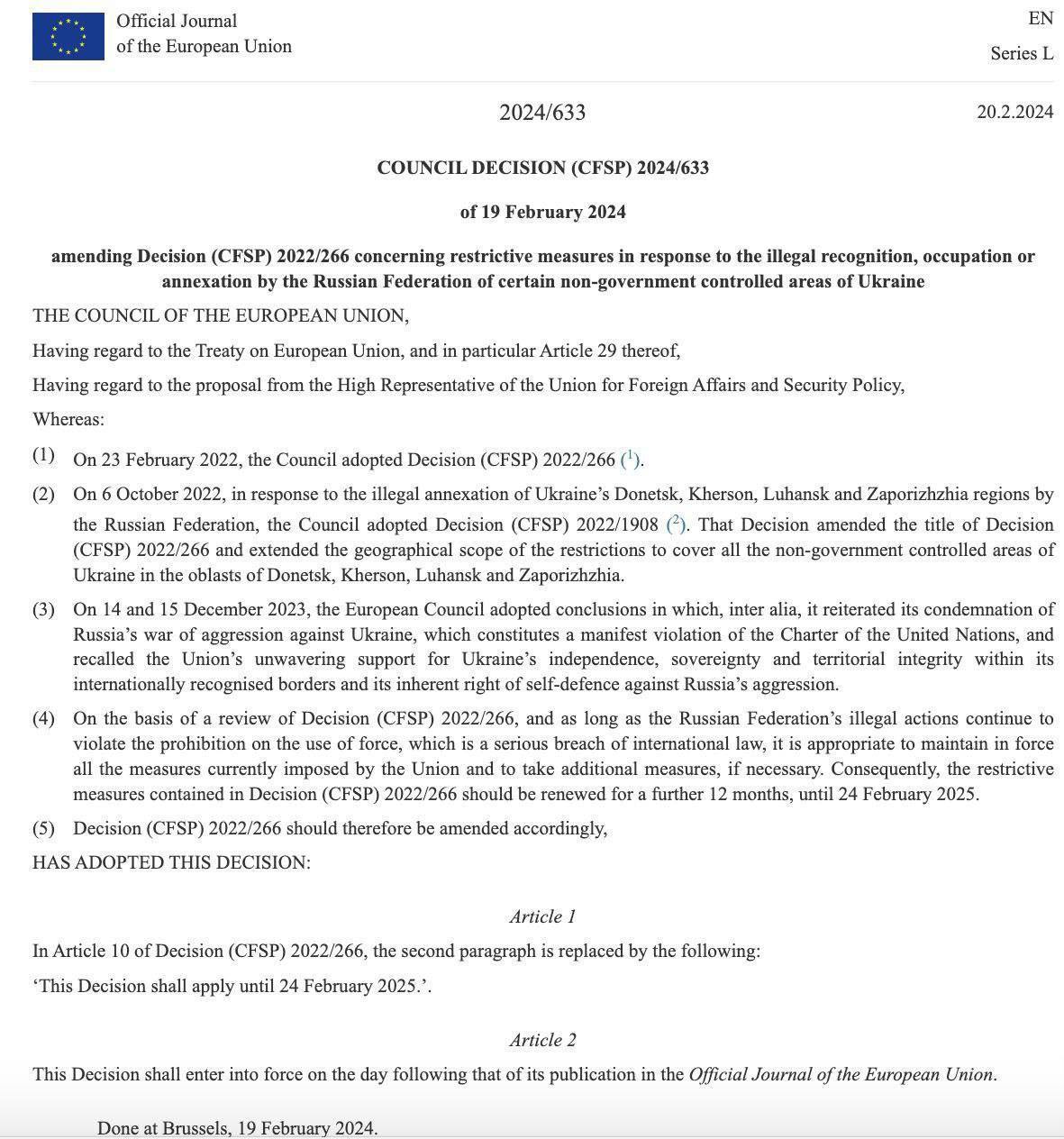 Рада Європейського Союзу продовжила дію санкцій проти Росії за окупацію територій України. Санкції діятимуть до 25 лютого 2025 року, йдеться в Офіційному журналі ЄС.