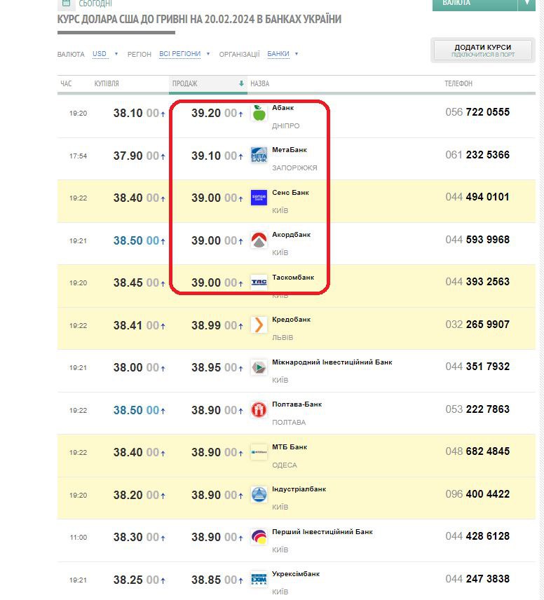 Кілька банків надвечір 20 лютого підняли свої готівкові курси продажу долара в касах до 39 грн/$ і вище, багато хто зробив це після 19 години. Максимальна вартість американської валюти досягла 39,10 грн/$ та 39,20 грн/$, її виставили Метабанк та А – Банк відповідно.