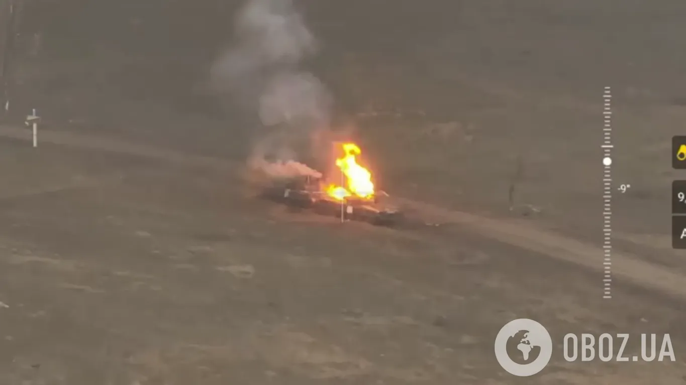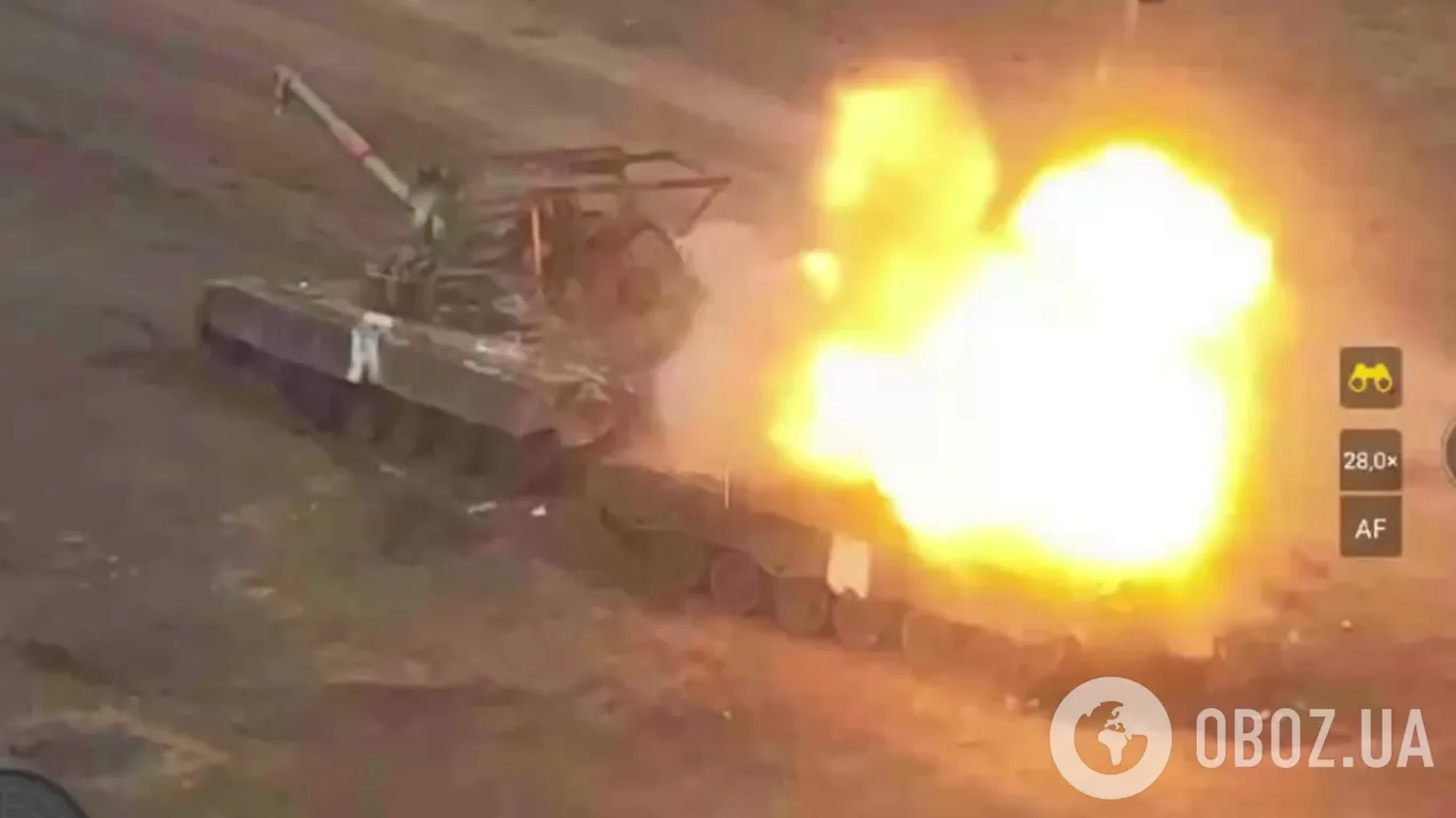 Після першого удару над одним із танків почав підніматися дим. Друге влучення FPV-дрона було ще яскравішим. Імовірно, боєкомплект російського танка здетонував.