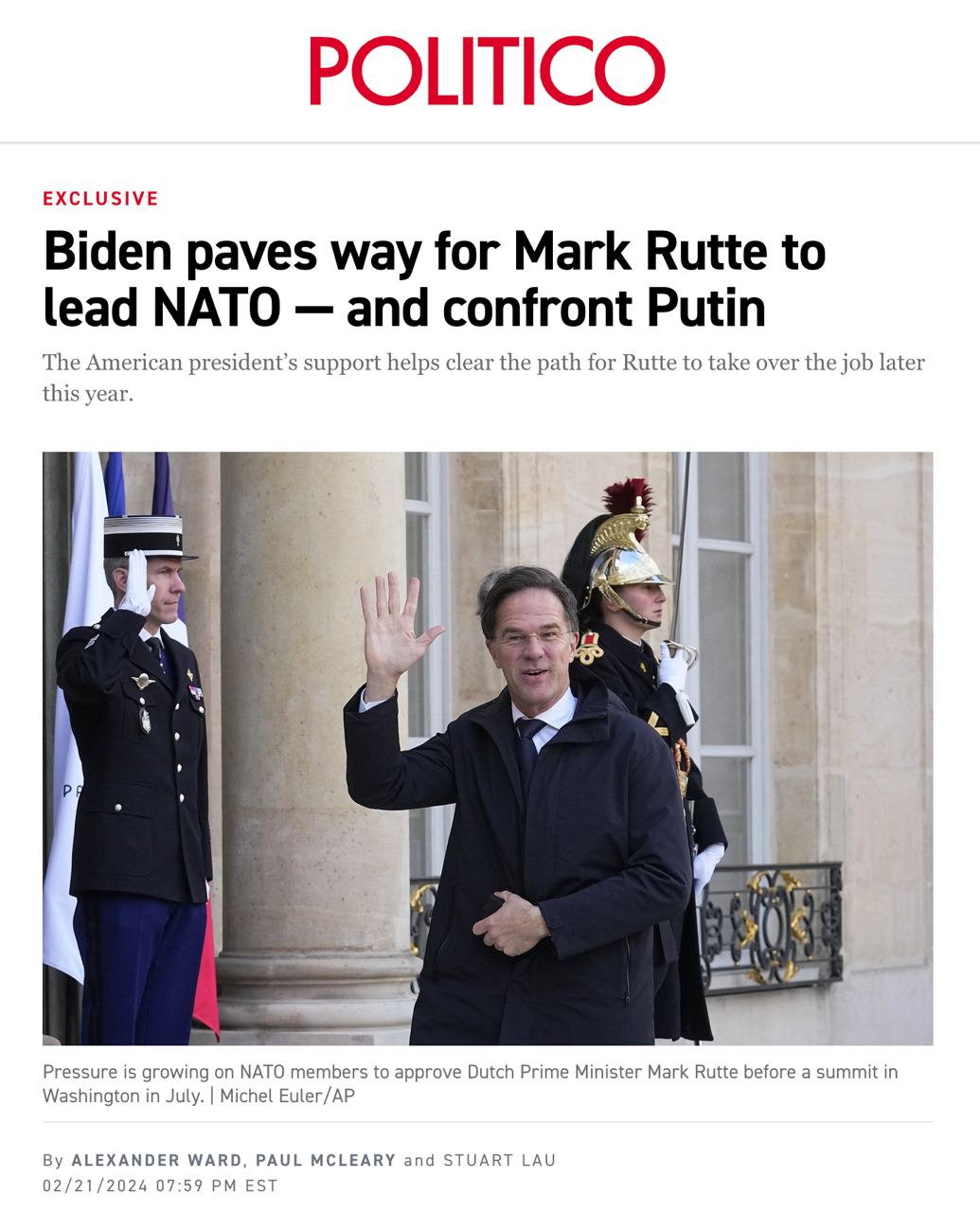 Офіційний представник США анонімно повідомив Politico, що Байден підтримує кандидатуру прем’єра Нідерландів Марка Рютте на посаду Генсека НАТО.
