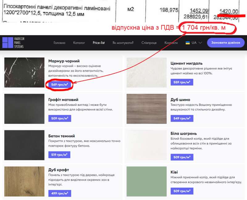 Крім того, декоративні ламіновані гіпсокартонні панелі 1200х2700х12,5 врахували по 1 704 грн/кв. м. Їхній виробник невідомий. Сайт «Viadecor» пропонує стінові панелі «Віадекор» з ламінованого гіпсокартону по 499-569 грн/кв. м залежно від текстури, що втричі дешевше.