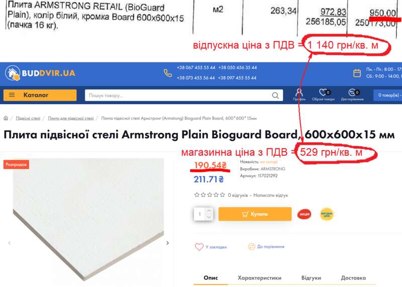Білі плити Armstrong Retail (BioGuard Plain) 600х600х15 із кромкою Board врахували по 1 140 грн/кв. м. На ринку білі плити Armstrong BioGuard Plain 600х600х15 із кромкою Board можна знайти по 159–191 грн/шт., тобто по 441-529 грн/кв. м, що мінімум удвічі дешевше.