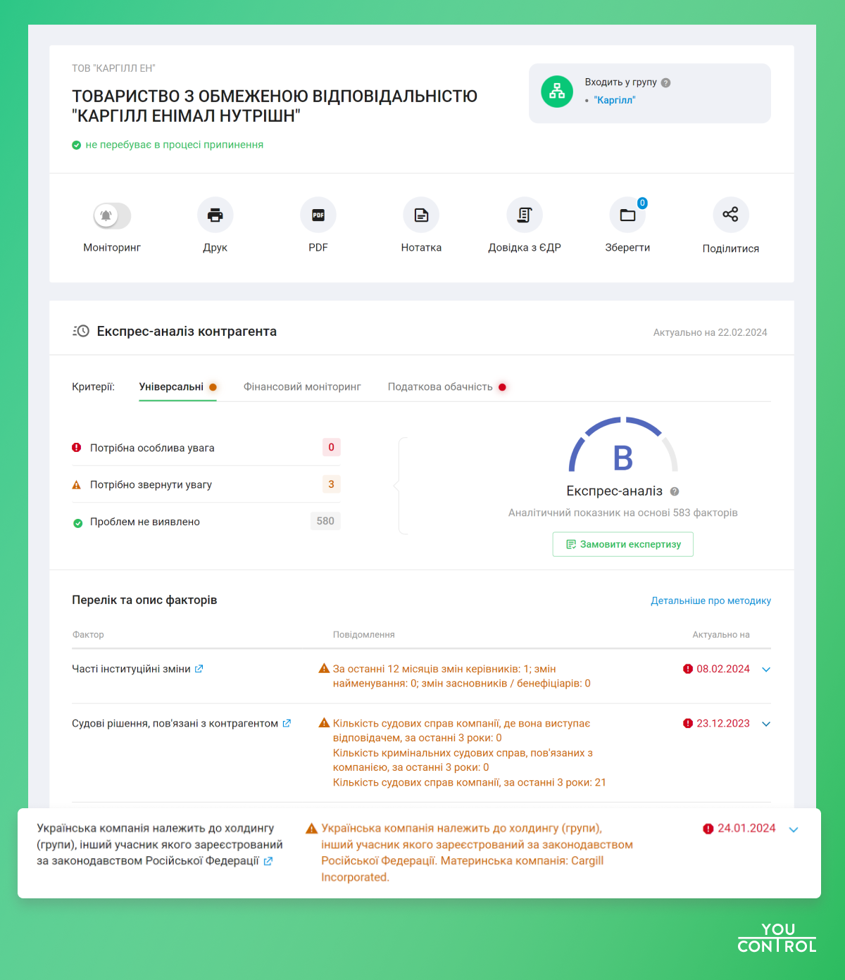 Ще 19 компаній з вибірки належить до холдингу/групи, інший учасник якого зареєстрований за законодавством Російської Федерації. До прикладу, це 4 компанії з ФПГ “Церсаніт”, ключовою особою якої є вищезгаданий Міхал Соловов. А також дві компанії зі складу ФПГ “Каргілл”. Міжнародна група компаній Cargill в Україні займається виробництвом та торгівлею зерновими та олійними культурами, переробкою насіння соняшника та сої.