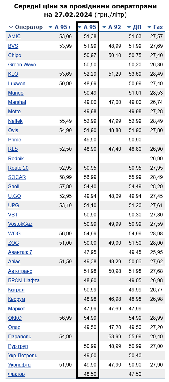 Найнижчі ціни на ресурс встановили у мережі Авантаж 7 – 47,95 грн/л. А крім того, Маркет – 47,99 грн/л.
