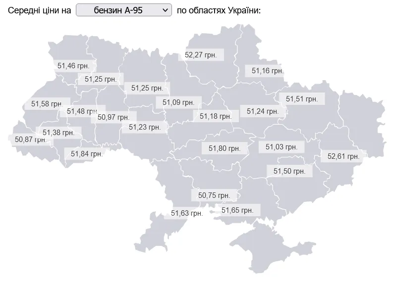 У регіонах бензин А-95 продають по 50,75-52,61 грн/л. Тобто, різниця між "найдорожчим" і "найдешевим" складає майже 1,9 грн/л.