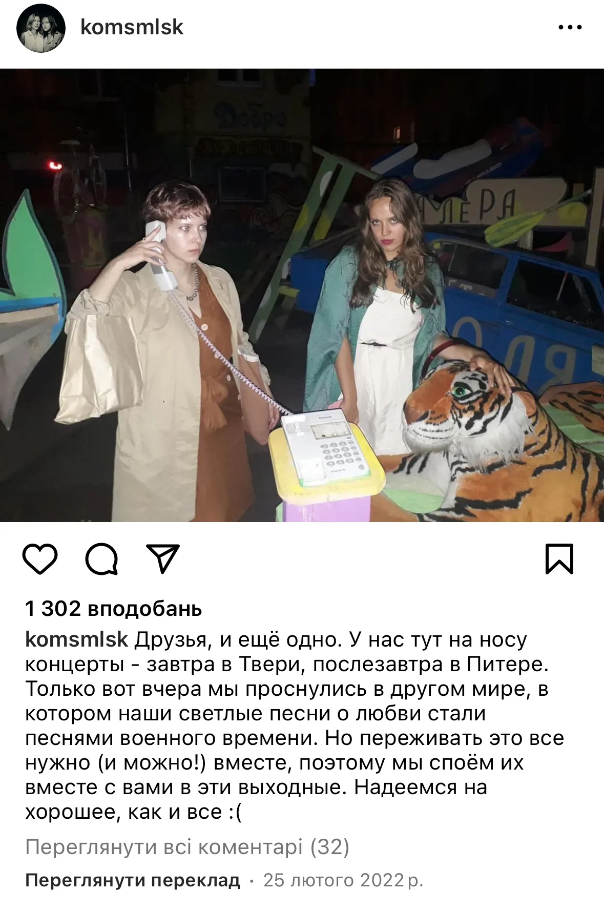 Зараз на Instagram-сторінці групи зберігся лише один пост щодо злочинів РФ в Україні, датований лютим 2022-го. "Лише ось учора ми прокинулися в іншому світі, в якому наші світлі пісні про кохання стали піснями воєнного часу", – йдеться у ньому. Пізніше того ж року росіянки розповіли, що допомагають українським біженцям, які опинилися на території Росії.