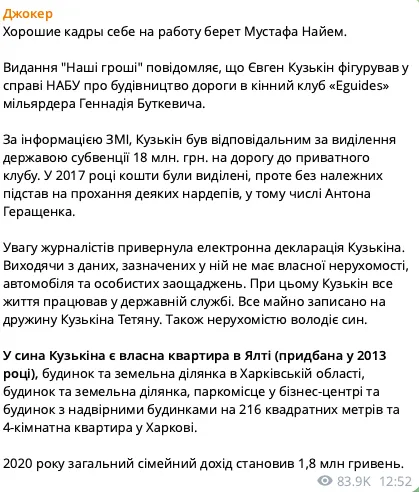 "У сина Кузькіна є власна квартира в Ялті (придбана у 2013 році), будинок та земельна ділянка в Харківській області, будинок та земельна ділянка, паркомісце у бізнес-центрі та будинок з надвірними будинками на 216 квадратних метрів та 4-кімнатна квартира у Харкові. 2020 року загальний сімейний дохід становив 1,8 млн гривень", – пише канал.