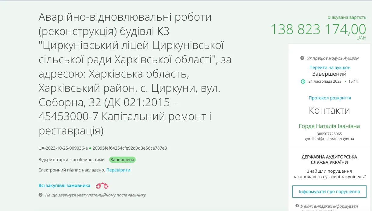 У мережі також нагадали про сумнівні тендери, які проводить Держагентство відновлення та розвитку інфраструктури. Зокрема, на відновлення ліцею у населеному пункті Циркуни в Харківській області на 138 млн грн.