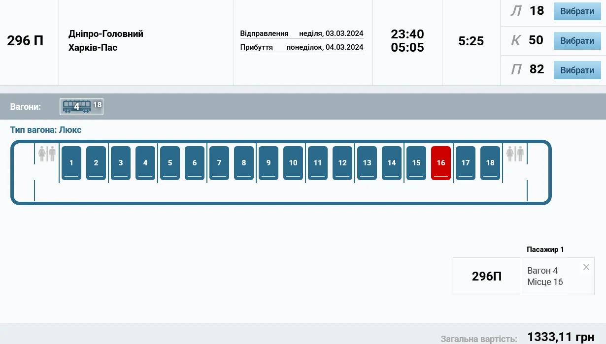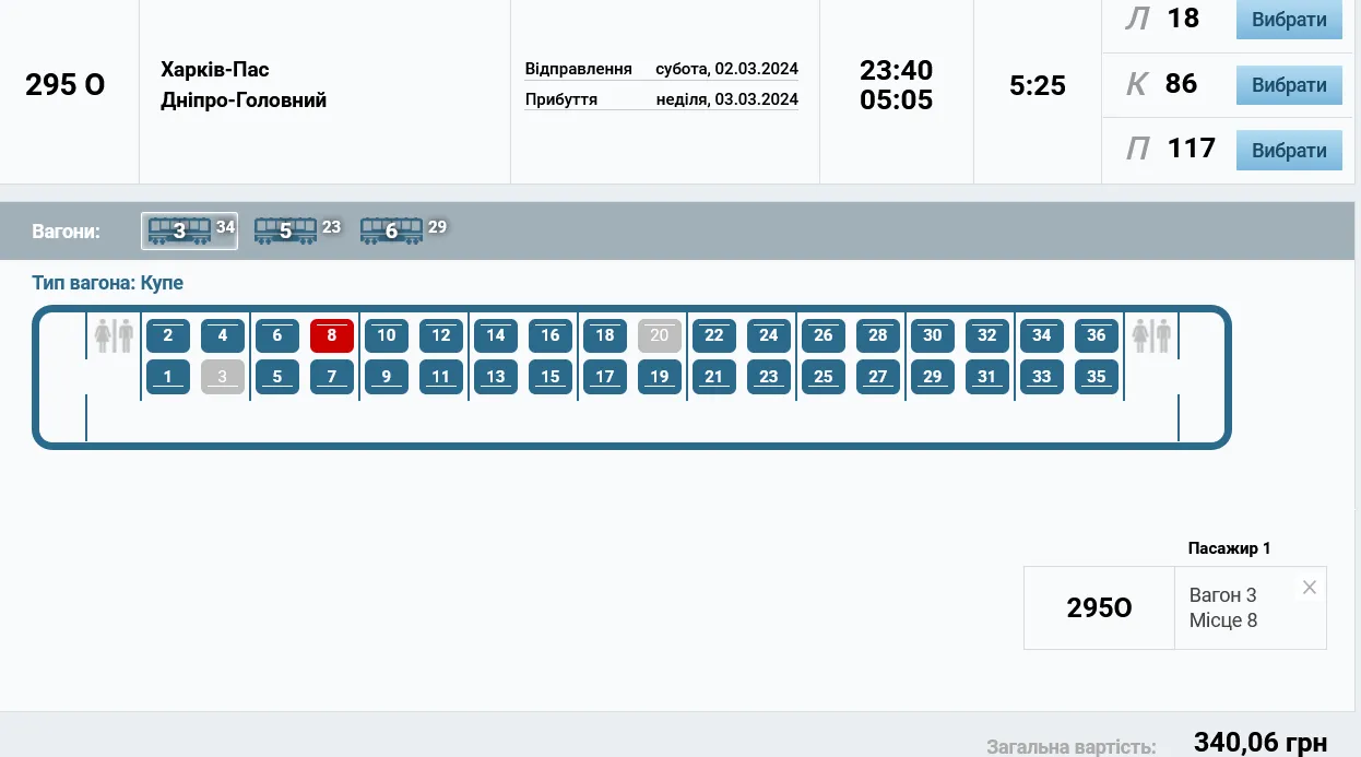 На рейс 3 березня з Дніпра до Харкова квитки також продаються у люкс, купе та плацкарт. Однак ціни на них дещо вищі. Так: