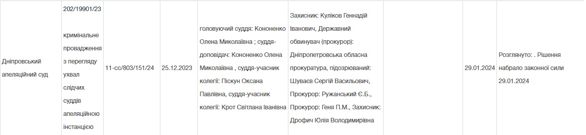 Захист Шуваєва оскаржив відповідну ухвалу з посиланням на низку процесуальних порушень. В апеляційній інстанції встановили, що нова підозра "Мазепі" де-факто ґрунтується на матеріалах первинного провадження щодо авторитета, які силовики виділили на тлі звісток щодо перспектив швидкого звільнення Сергія Васильовича на волю. Ба більше - на момент судового розгляду в "апеляшці" обидві справи знову об’єднали, внаслідок чого відносно "смотрящого" в одному і тому ж провадженні було застосовано два різних запобіжних заходи! З урахуванням цього судді дійшли висновку щодо незаконності вердикту щодо повторного арешту Сергія Шуваєва, та 29 січня 2024 року постановили негайно звільнити його з-під варти.