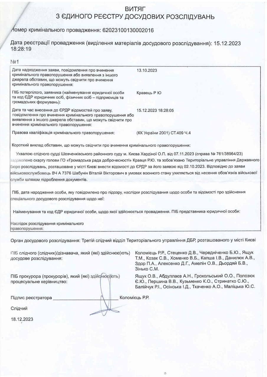 У грудні слідчий суддя Шевченківського районного суду Києва зобов’язав ДБР зареєструвати заяву про вчинення кримінального правопорушення за ознаками підроблення документів та ухилення від військової служби Віталієм Шабуніним.