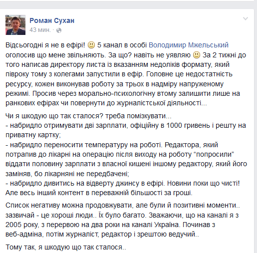 Про це на своїй сторінці у Facebook написав Роман Сухан, який працював кореспондентом на «5 каналі». Він також поскаржився на важкі умови праці на каналі, що належить президентові Петру Порошенку. За словами Сухана, свої скарги він раніше виклав у листі до директора каналу, після чого його звільнили.